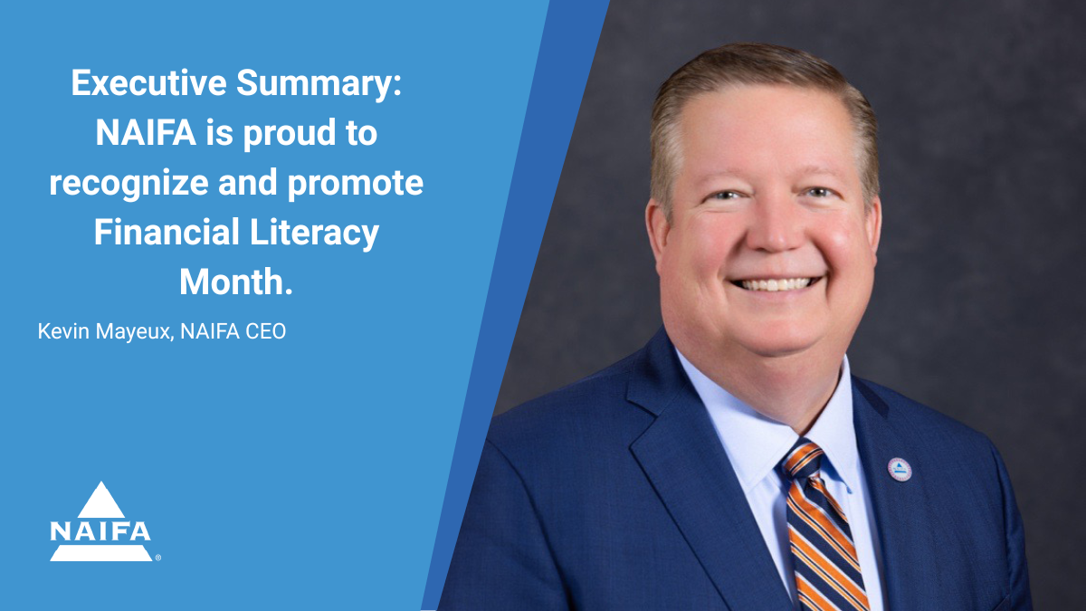 Each April, NAIFA is proud to recognize and promote Financial Literacy Month. Consumers with a strong understanding of financial concepts are much less likely to suffer money-related stress or hardships. They are more likely to effectively manage debt, develop written financial plans, create and achieve financial goals, prepare for retirement, and purchase financial risk-protection products. Financial literacy strengthens families, American communities, and the economy.