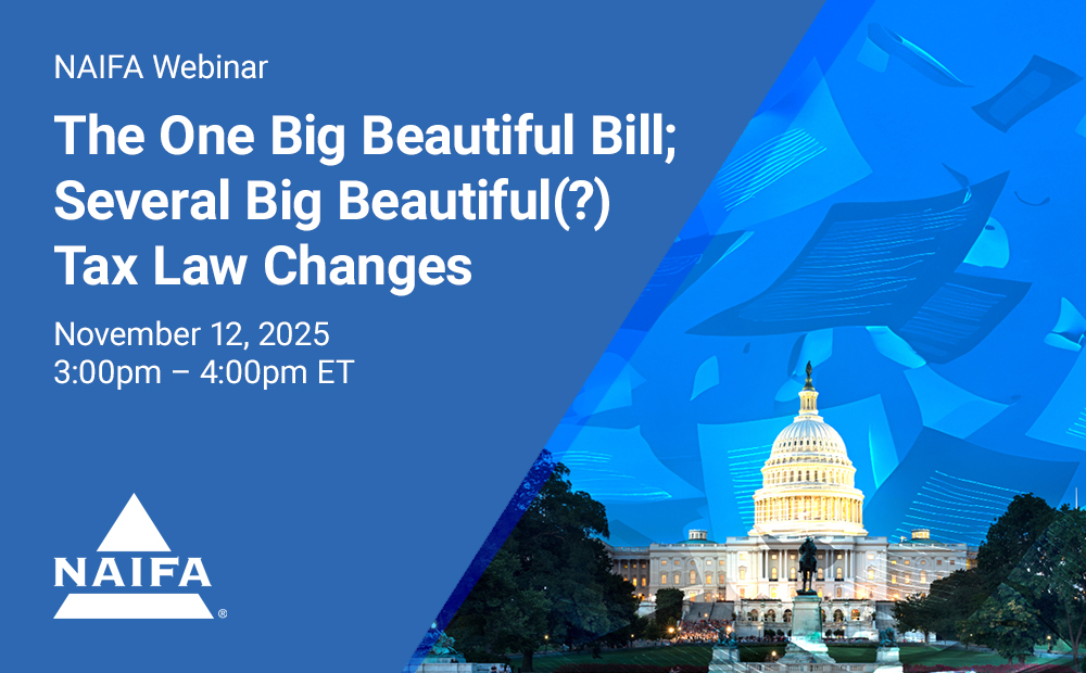 Recent tax law updates are reshaping the way financial professionals approach estate planning and charitable giving. Join NAIFA for “The One Big Beautiful Bill; Several Big Beautiful(?) Tax Law Changes” on Wednesday, November 12, 2025, from 3:00 to 4:00 pm Eastern for a clear overview of the key provisions introduced by this major legislation and what they mean for your clients.