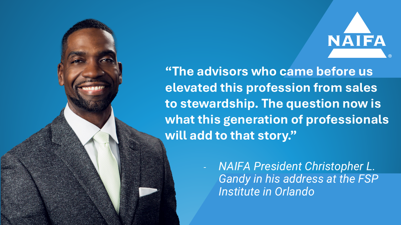 In his address to FSP Institute attendees Feb. 19 in Orlando, NAIFA President Christopher Gandy welcomed the NAIFA members with a powerful reminder: This gathering represents more than advanced education; it represents the future of a profession built on more than 130 years of purpose.