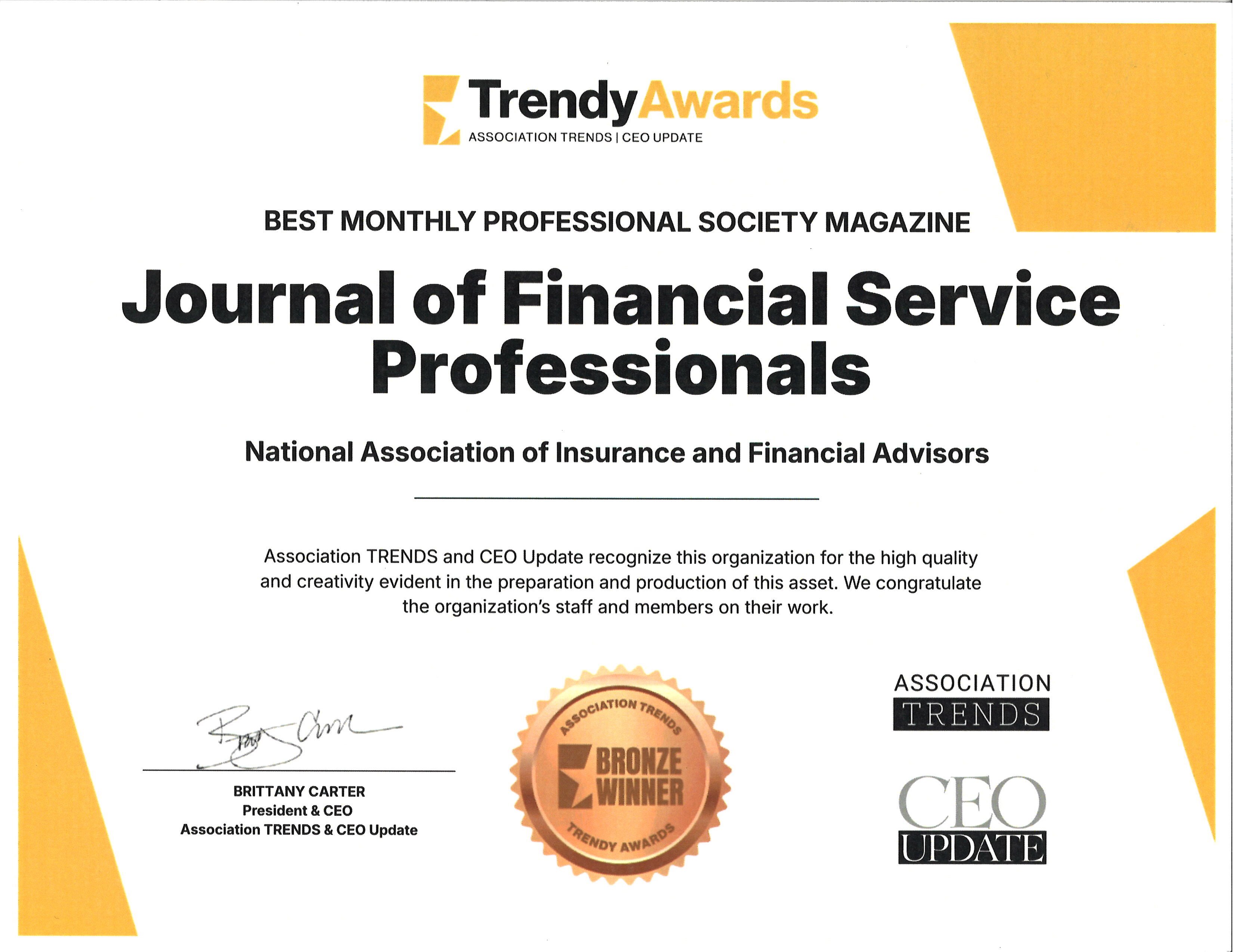 NAIFA is proud to announce that the Journal of Financial Service Professionals has been honored with a 2026 Trendy Award in the category of Best Monthly Professional Society Magazine, recognizing excellence in association publishing and communications.