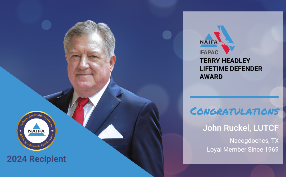 NAIFA is proud to announce that John M. Ruckel, LUTCF, a Financial Professional with MassMutual and owner of Ruckel Insurance and Financial Group in Nacogdoches, Texas, is the 2024 recipient of NAIFA’s Terry Headley Lifetime Defender Award.