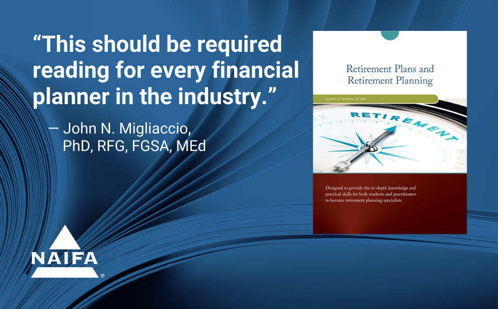 Retirement Plans and Retirement Planning, a newly revised ebook by Kenn B. Tacchino, JD, LLM, Professor of Taxation and Financial Planning at Widener University, is a valuable resource for financial planning students and practitioners. The book is published by FSP, a NAIFA Community, and Professor Tacchino is editor of FSP's Journal of Financial Service Professionals, which NAIFA members may access online as an educational benefit.